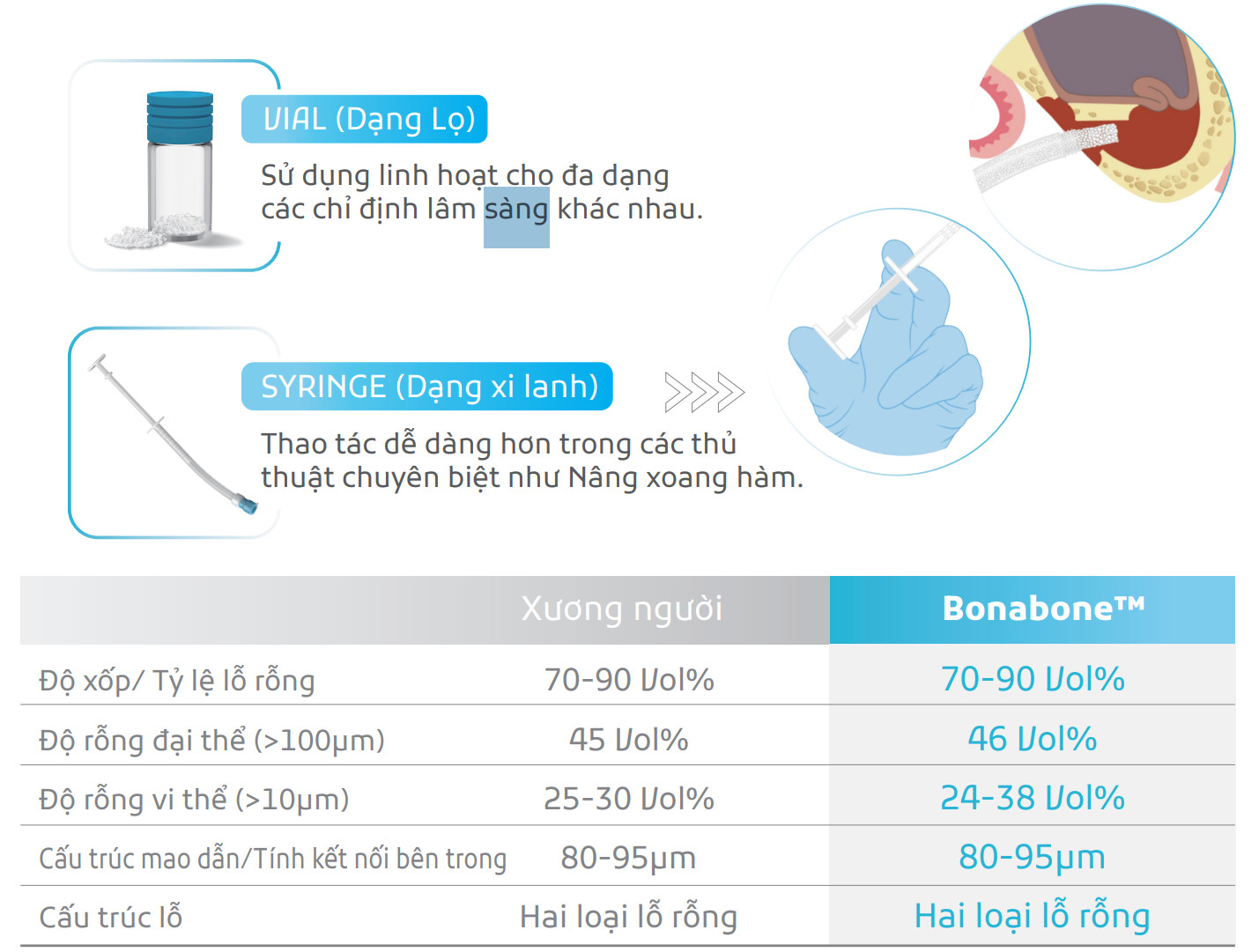 Vật liệu ghép xương bò tự nhiên Bonabone™ được sản xuất bằng Công nghệ BIOTIEN® và quy trình TCC (Temperature Controlled Calcination – Nung kiểm soát nhiệt độ), mang lại cấu trúc tối ưu gần giống nhất với xương người và đáp ứng nhu cầu tái cấu trúc xương (remodeling) hoàn hảo.